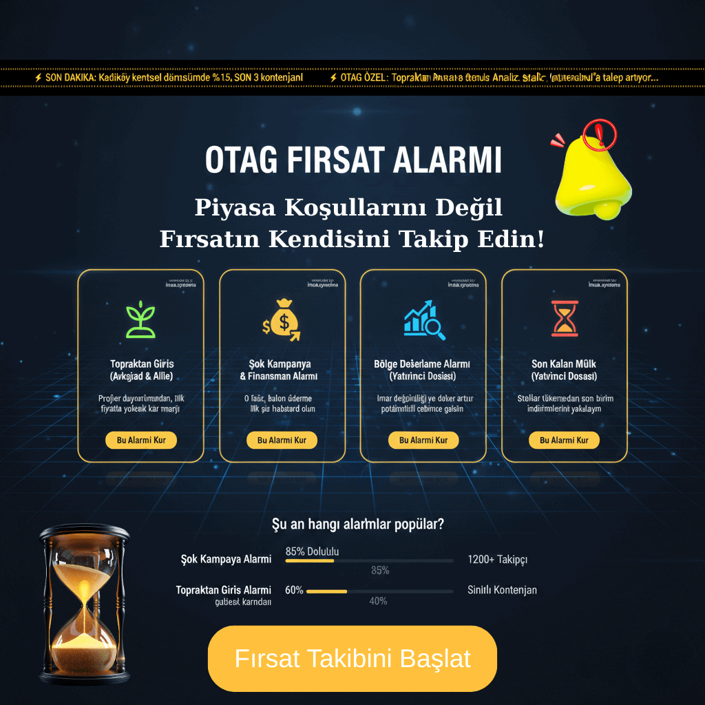 Kişiselleştirilmiş Yatırım Deneyimi: Sıradan ilan sitelerinin aksine, OTAG Fırsat Alarmı sistemi piyasa verilerini 7/24 tarar. Size sadece genel duyuruları değil; bütçenize, hedeflediğiniz bölgeye ve tercih ettiğiniz yatırım modeline (Topraktan giriş, kentsel dönüşüm vb.) en uygun “nokta atışı” fırsatları iletiriz.